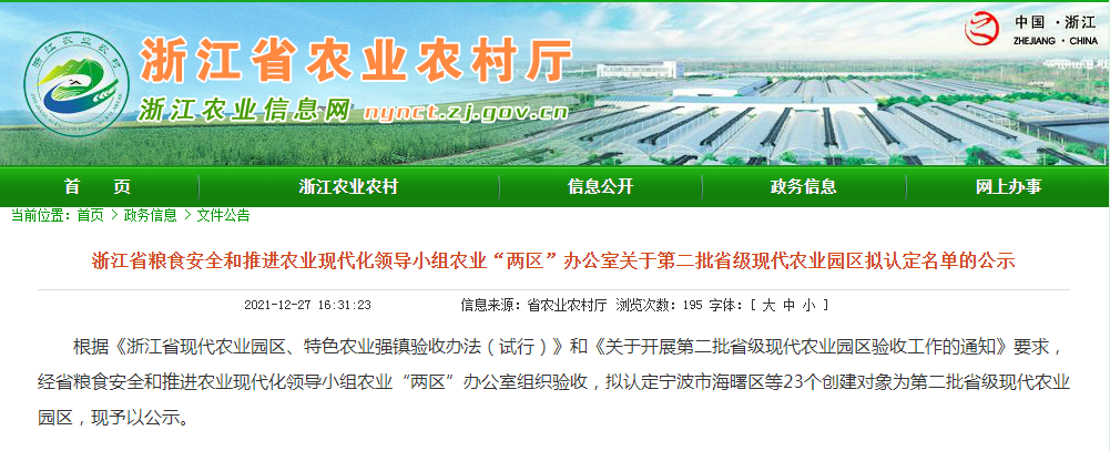 根據《浙江省現代農業園區、特色農業強鎮驗收辦法(試行)》和《關于開展第二批省級現代農業園區驗收工作的通知》要求,經省糧食安全和推進農業現代化領導小組農業“兩區”......