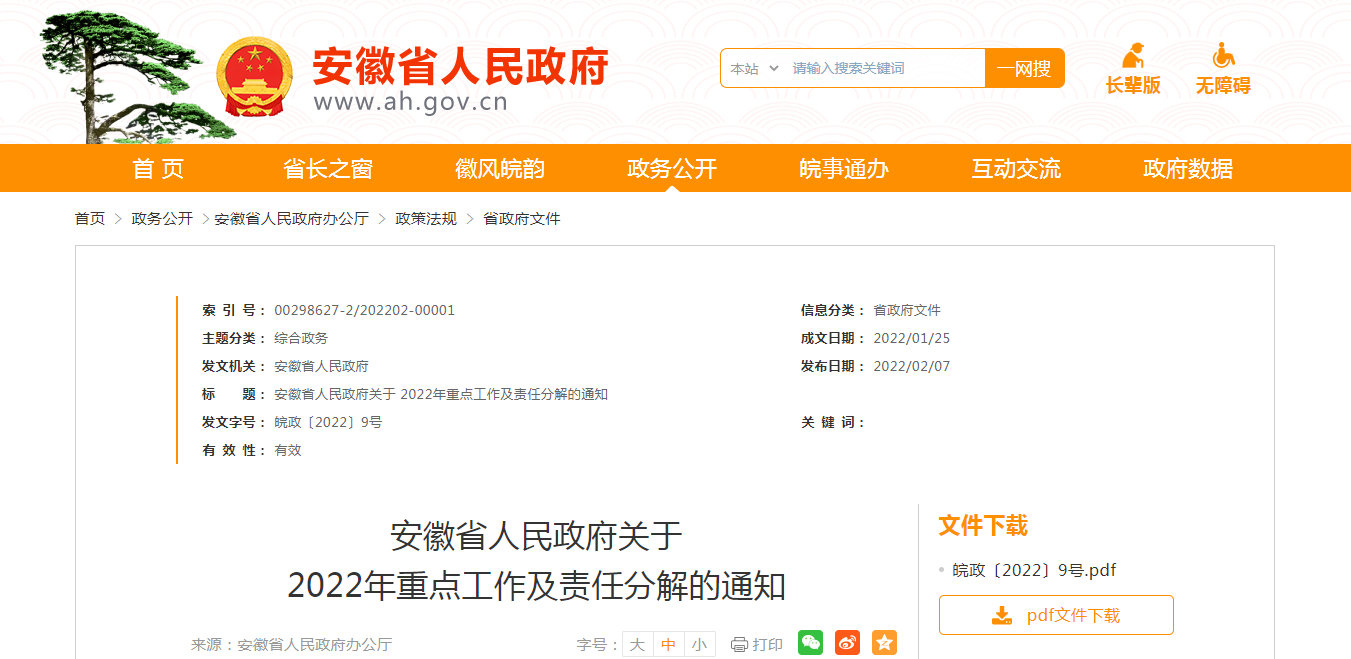 各市、縣人民政府,省政府各部門、各直屬機構:2022年是黨的二十大召開之年,是全面落實省第十一次黨代會精神、加快建設現代化美好安徽的重要一年。為貫徹落實中央決策......