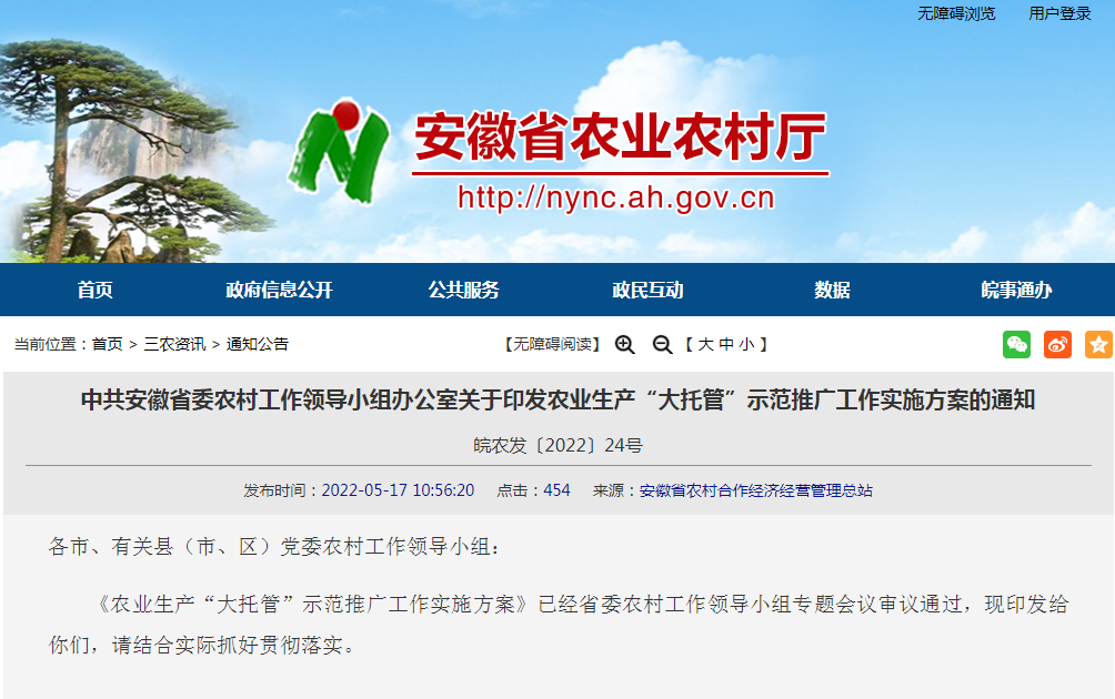 農業生產“大托管”示范推廣工作實施方案為落實省委、省政府《科技強農機械強農促進農民增收行動方案(2022-2025年)》要求,推進農業生產“大托管”示范推廣工作......