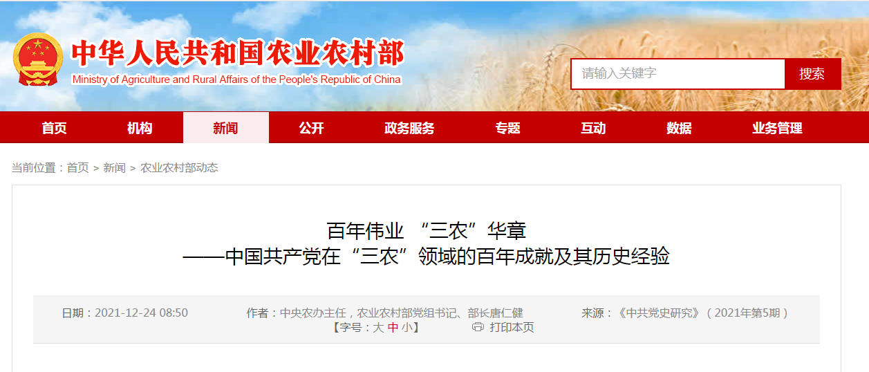 《中共黨史研究》(2021年第5期)刊發中央農辦主任,農業農村部黨組書記、部長唐仁健題為《百年偉業 “三農”華章——中國共產黨在“三農”領域的百年成就及其歷......