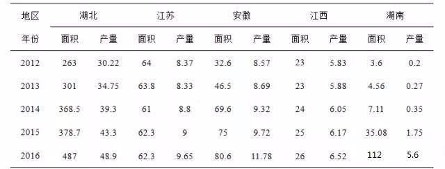 表1 2012-2016年五個(gè)主產(chǎn)省份小龍蝦養(yǎng)殖面積和產(chǎn)量情況 單位:萬畝/萬噸