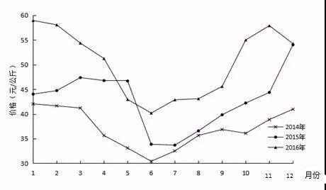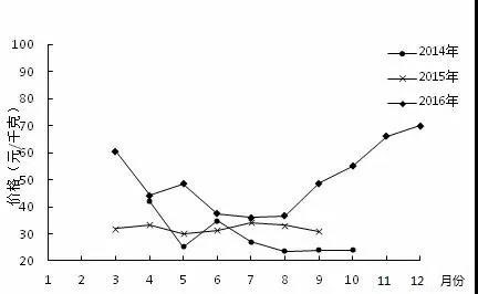 小龍蝦的生產(chǎn)供給季節(jié)性特征明顯,市場價(jià)格隨上市供給量變化而波動。根據(jù)2014-2016年小龍蝦批發(fā)價(jià)格和出塘價(jià)格看。近三年小龍蝦價(jià)格逐年提高,價(jià)格呈季節(jié)性波動,每年的6-7月上市旺季期間價(jià)格最低,春冬季上市淡季期間價(jià)格走向峰值。