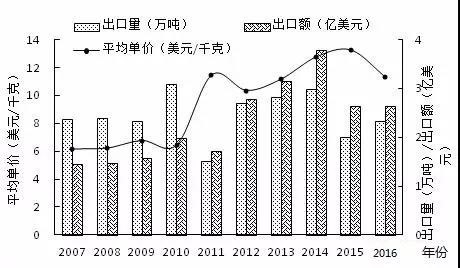 受國內(nèi)消費(fèi)刺激及技術(shù)性貿(mào)易壁壘影響,2015年后小龍蝦出口量總體呈下降趨勢。2016年小龍蝦出口量較2014年降低0.64萬噸,下降21.48%。從出口價(jià)格情況看,2007年以來小龍蝦出口單價(jià)呈總體上升趨勢,但2016年受國際蝦價(jià)下跌影響,出口單價(jià)出現(xiàn)下滑。同時(shí),小龍蝦進(jìn)口平均單價(jià)總體呈逐年上漲態(tài)勢,2014年后趨于平穩(wěn)。