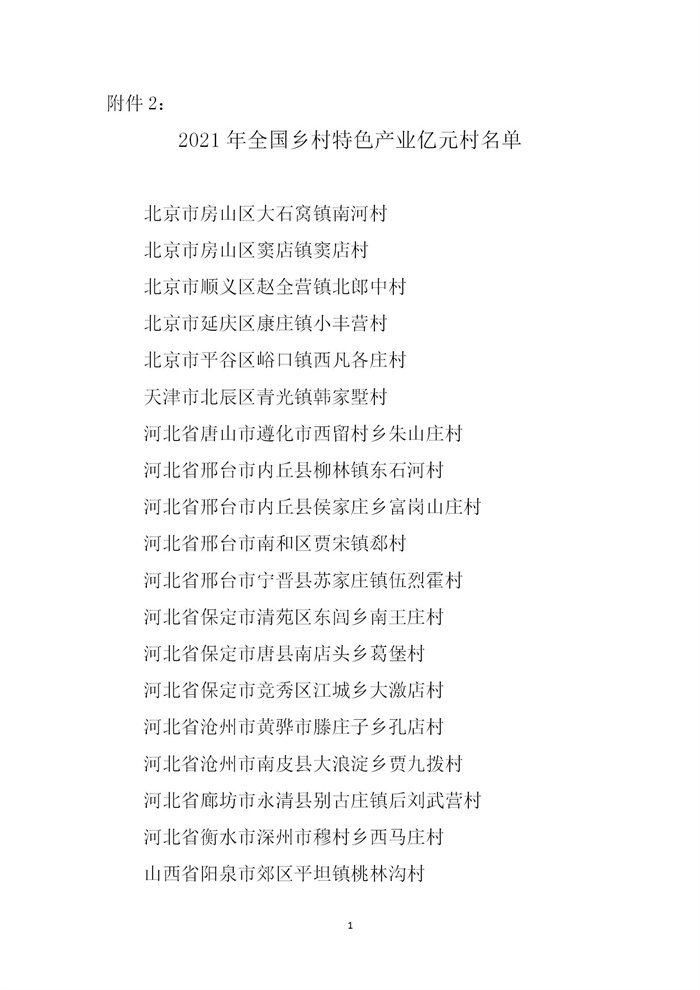 附件:2021年全國鄉(xiāng)村特色產(chǎn)業(yè)十億元鎮(zhèn)億元村名單
