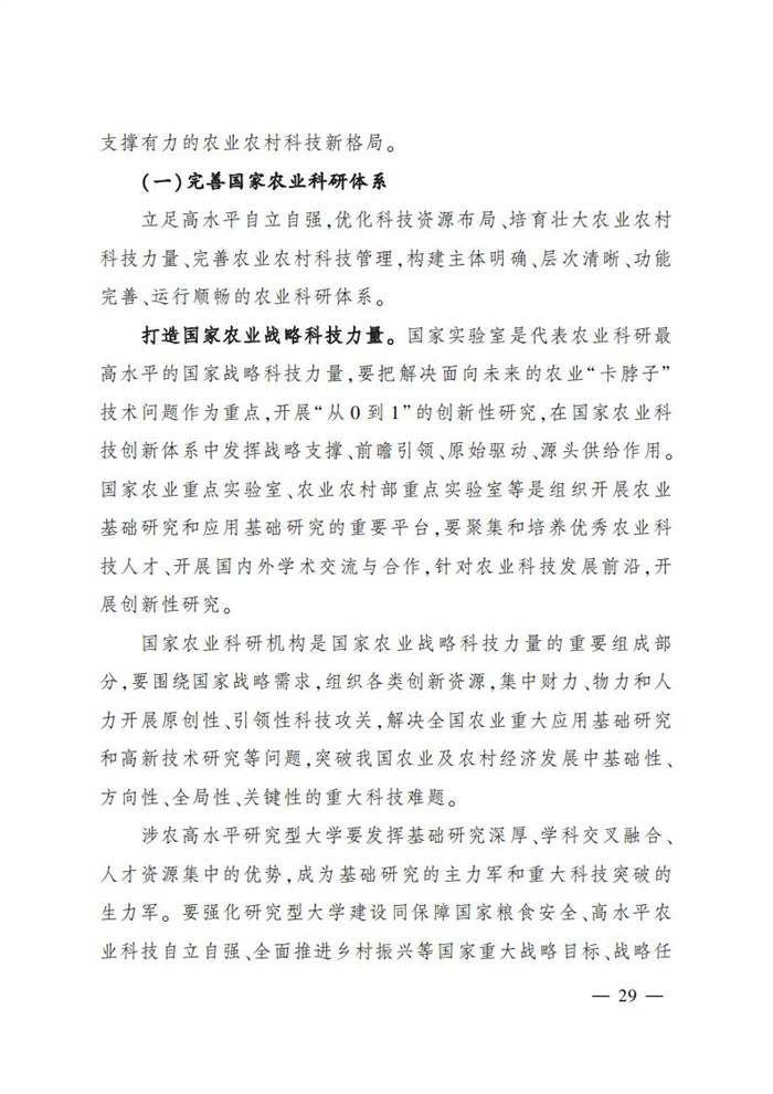 ———農業戰略科技力量建設進入新階段。完善各級各類農業創新主體、平臺布局和功能定位,建設一批世界一流國家農業科研機構、涉農高水平研究型大學,培育一批涉農科技領軍企業,重點培養一批全國農業農村科研杰出人才。優化升級50個國家現代農業產業技術體系。在生物育種、生物安全、天然橡膠、微生物、深藍漁業等領域布局一批農業重大科技基礎設施和平臺。布局提升一批農業領域國家重點實驗室,384個農業農村部學科群重點實驗室。建設70個國家農業科學觀測實驗站和110個農業科研試驗基地。