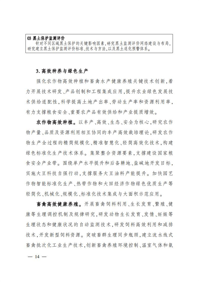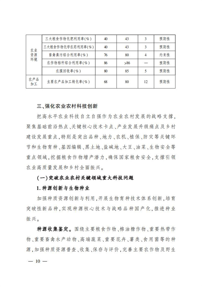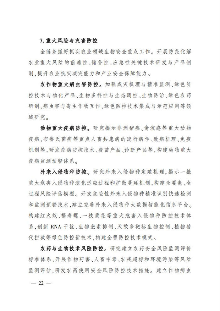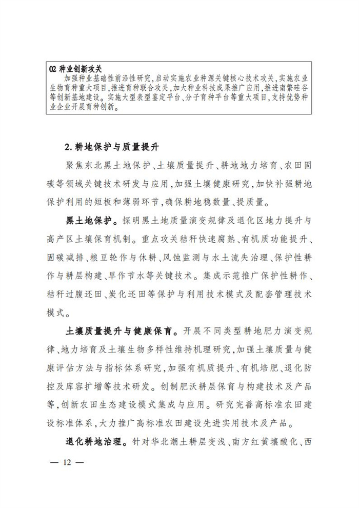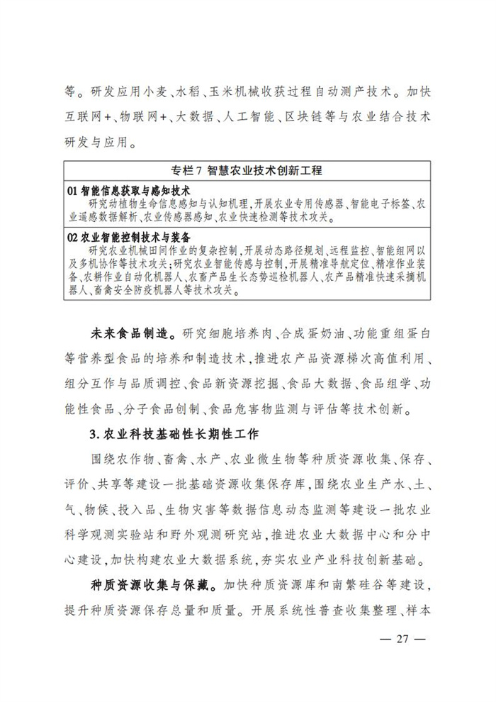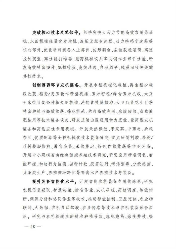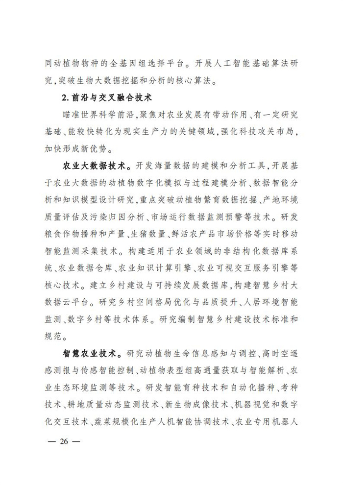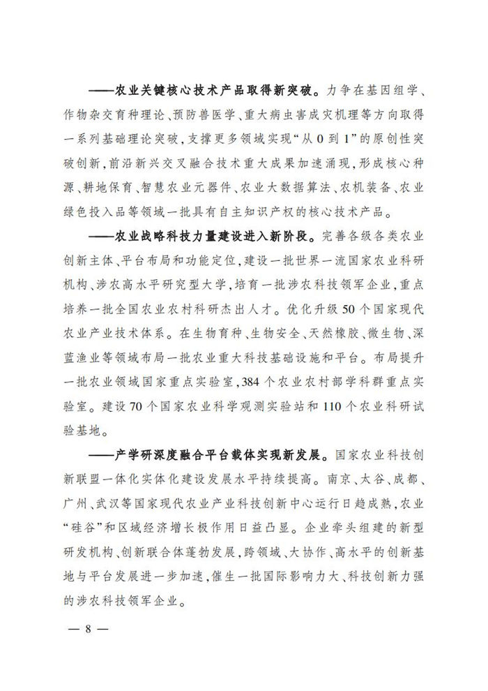 ———農業關鍵核心技術產品取得新突破。力爭在基因組學、作物雜交育種理論、預防獸醫學、重大病蟲害成災機理等方向取得一系列基礎理論突破,支撐更多領域實現“從0到1”的原創性突破創新,前沿新興交叉融合技術重大成果加速涌現,形成核心種源、耕地保育、智慧農業元器件、農業大數據算法、農機裝備、農業綠色投入品等領域一批具有自主知識產權的核心技術產品。
