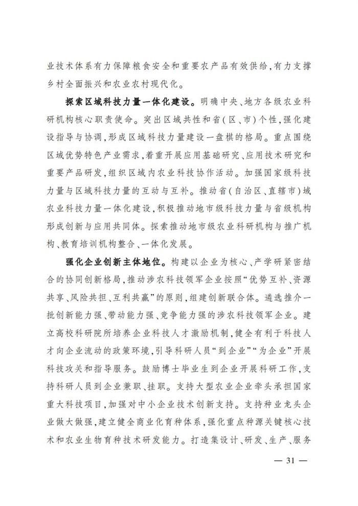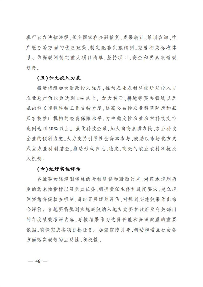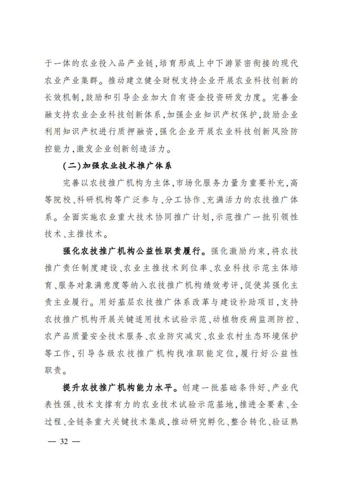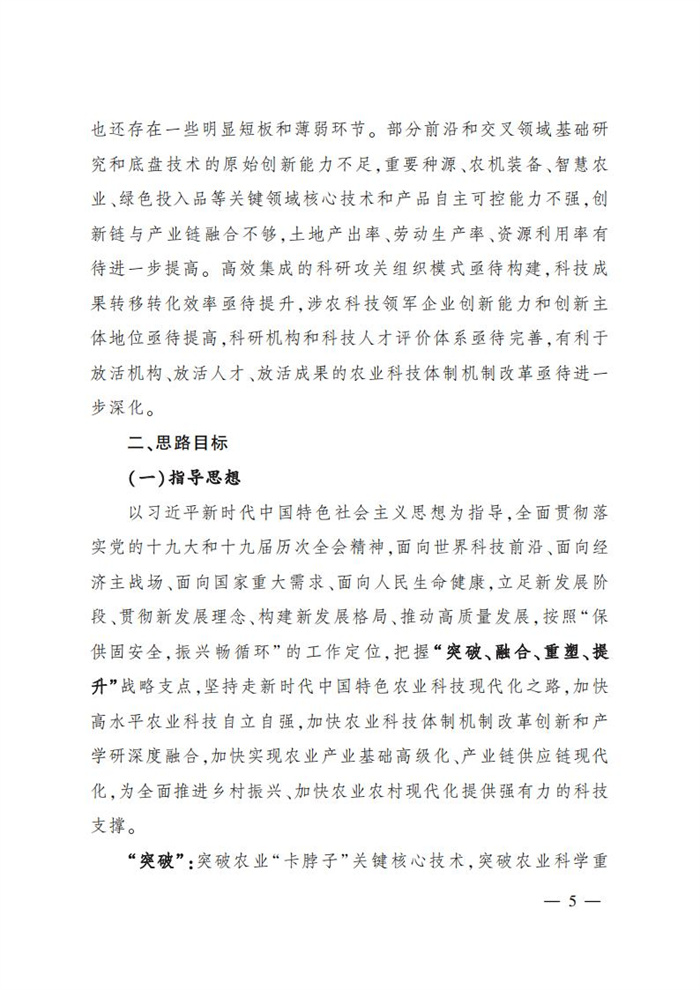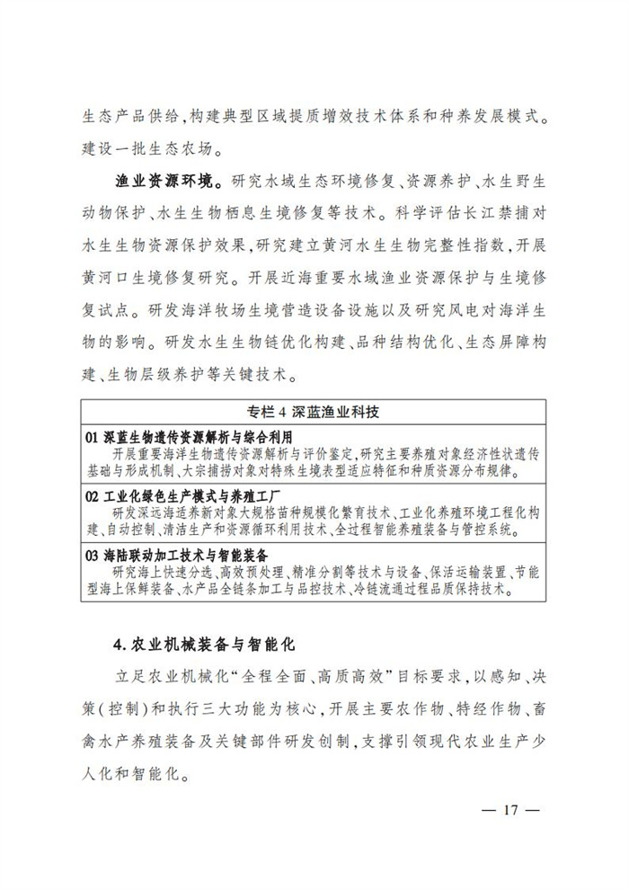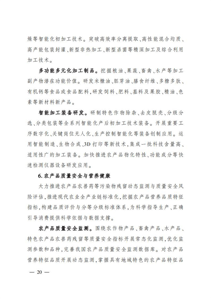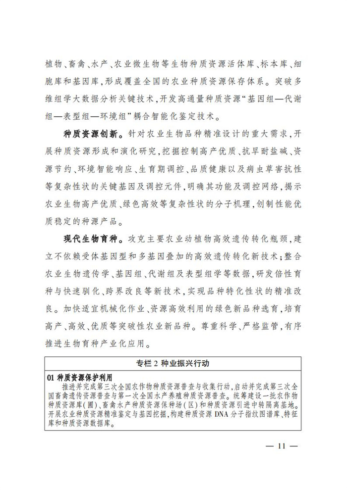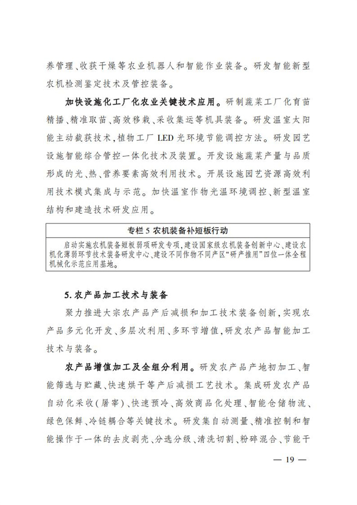 ———農業關鍵核心技術產品取得新突破。力爭在基因組學、作物雜交育種理論、預防獸醫學、重大病蟲害成災機理等方向取得一系列基礎理論突破,支撐更多領域實現“從0到1”的原創性突破創新,前沿新興交叉融合技術重大成果加速涌現,形成核心種源、耕地保育、智慧農業元器件、農業大數據算法、農機裝備、農業綠色投入品等領域一批具有自主知識產權的核心技術產品。