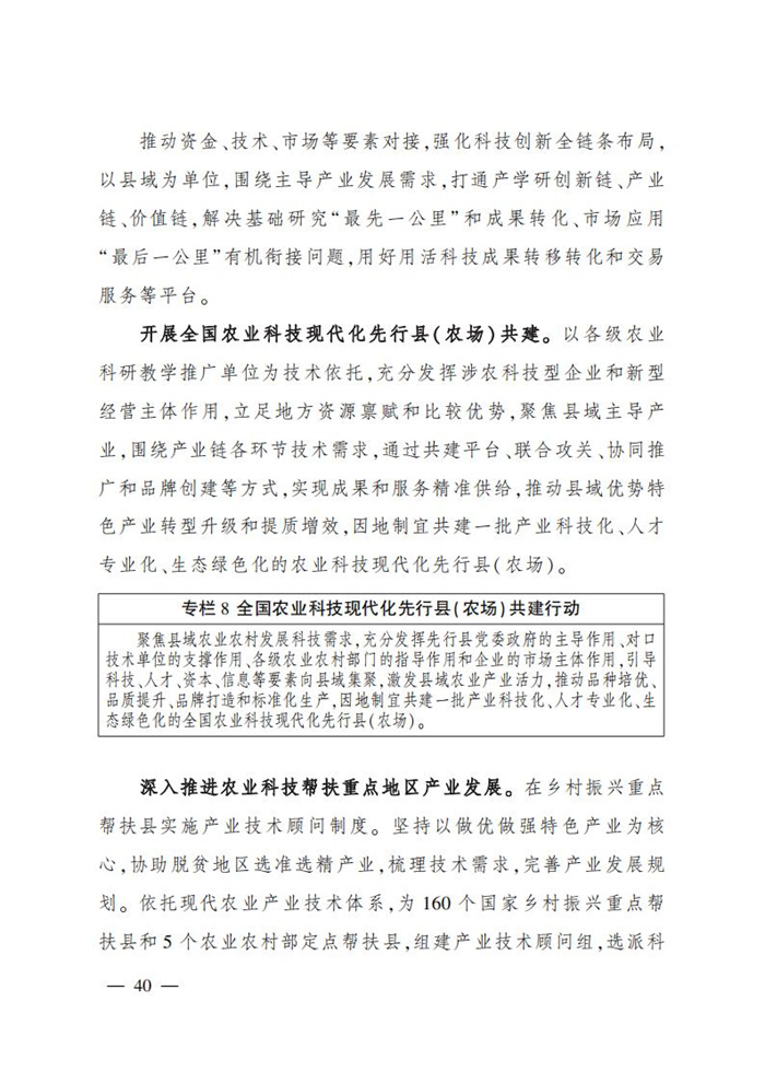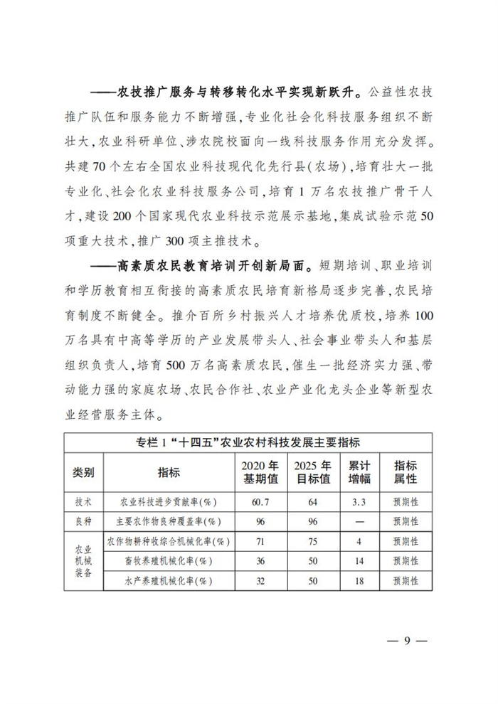 ———農技推廣服務與轉移轉化水平實現新躍升。公益性農技推廣隊伍和服務能力不斷增強,專業化社會化科技服務組織不斷壯大,農業科研單位、涉農院校面向一線科技服務作用充分發揮。共建70個左右全國農業科技現代化先行縣(農場),培育壯大一批專業化、社會化農業科技服務公司,培育1萬名農技推廣骨干人才,建設200個國家現代農業科技示范展示基地,集成試驗示范50項重大技術,推廣300項主推技術。