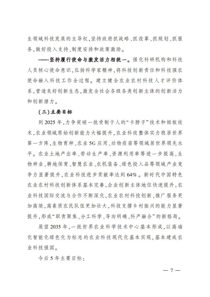 《規劃》指出,農業土地產出率、勞動生產率、資源利用率等進一步提高,生物種業、耕地保育、智慧農業、農機裝備、綠色投入品等領域產業競爭力顯著提升,農業科技進步貢獻率達到64%。新時代中國特色農業農村科技創新體系基本完善,企業創新主體地位快速提升,農業科技國際交流與合作不斷深化,農業農村科技創新、推廣服務更加高效,高素質農民隊伍更加壯大,科技支撐鄉村振興的能力顯著提升,形成“職責聚焦、分工科學、導向明確、科產融合”的新格局。展望2035年,一批世界農業科學技術中心基本形成,以高端化智能化綠色化為標志的農業科技現代化基本實現,基本建成農業科技強國。