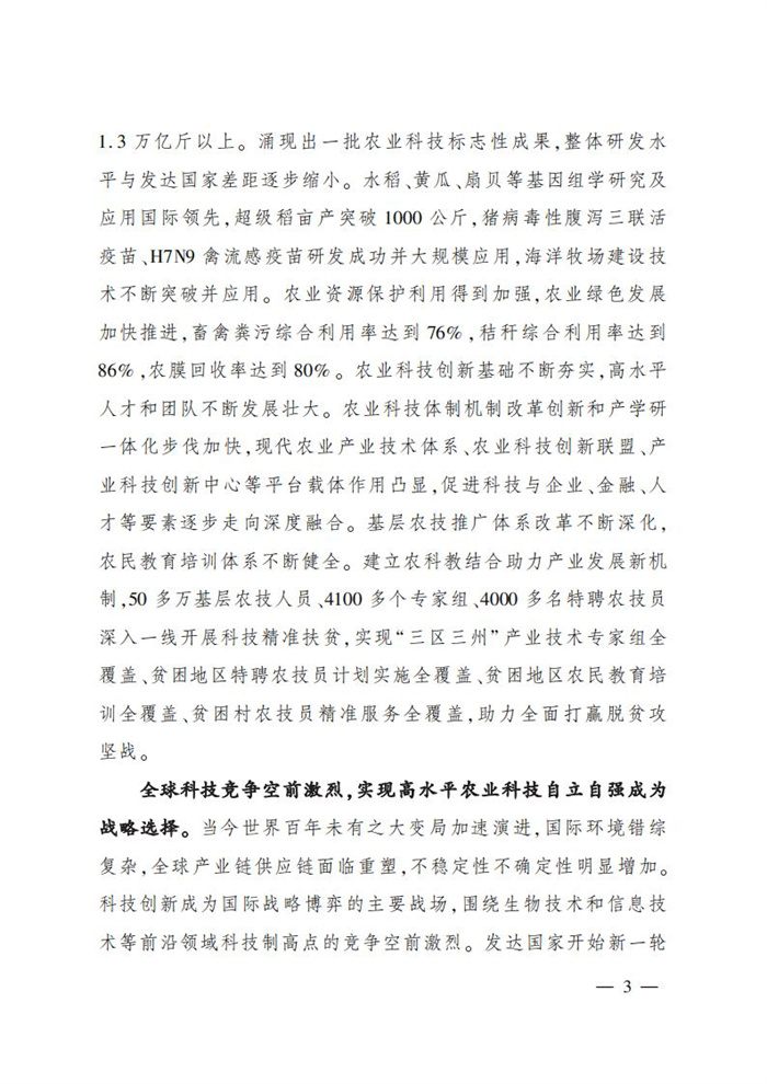 2021年12月29日,農業農村部印發《“十四五”全國農業農村科技發展規劃》,《規劃》提出,到2025年,力爭突破一批受制于人的“卡脖子”技術和短板技術,農業領域原始創新能力大幅提升,農業科技整體實力穩居世界第一方陣,生物育種、農業5G應用、動物疫苗等領域居世界領先水平。