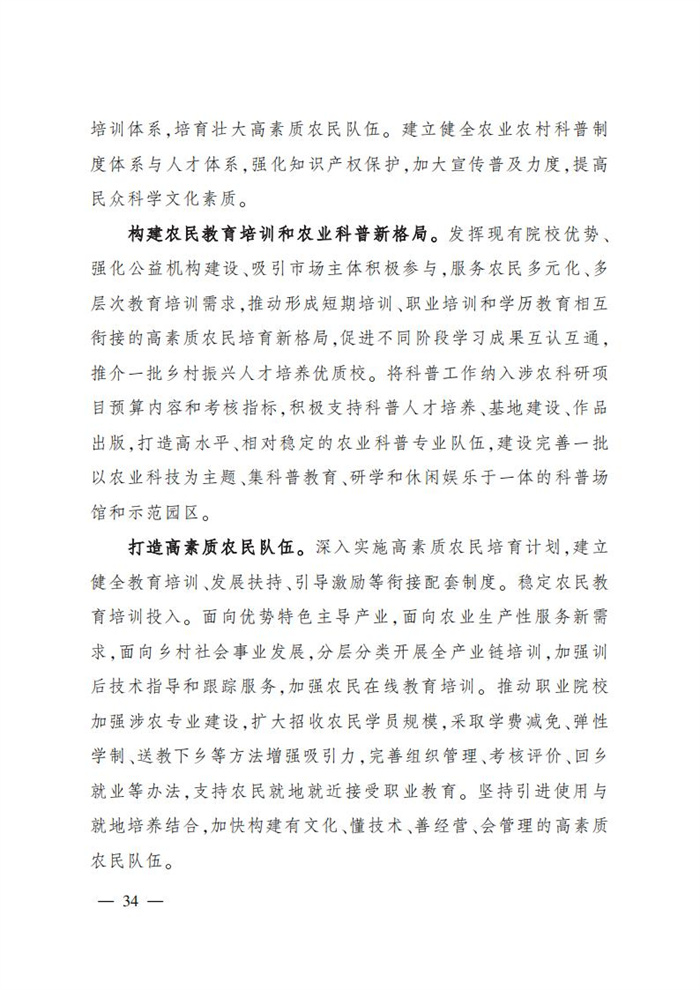 ———高素質農民教育培訓開創新局面。短期培訓、職業培訓和學歷教育相互銜接的高素質農民培育新格局逐步完善,農民培育制度不斷健全。推介百所鄉村振興人才培養優質校,培養100萬名具有中高等學歷的產業發展帶頭人、社會事業帶頭人和基層組織負責人,培育500萬名高素質農民,催生一批經濟實力強、帶動能力強的家庭農場、農民合作社、農業產業化龍頭企業等新型農業經營服務主體。