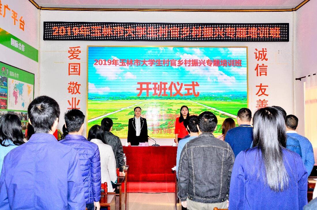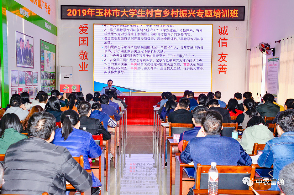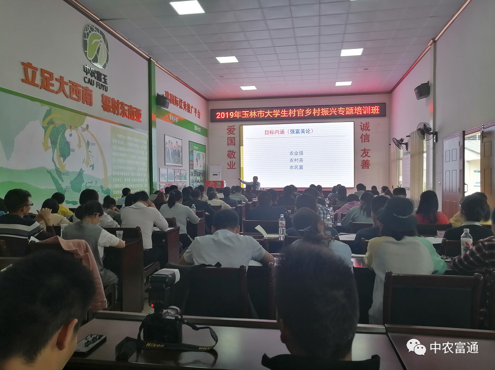 ▼11月26日,2019年玉林市大學生村官鄉村振興專題培訓班在中農富玉舉行開班儀式,廣西自治區農業農村廳發展規劃處處長羅應平等為玉林市大學生村官培訓班授課。