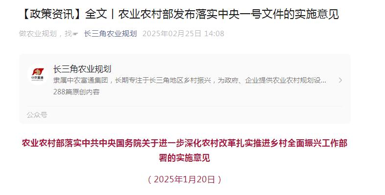 農業農村部落實中共中央國務院關于進一步深化農村改革扎實推進鄉村全面振興工作部署的實施意見(2025年1月20日)各省、自治區、直轄市農業農村(農牧)、畜牧獸醫、......
