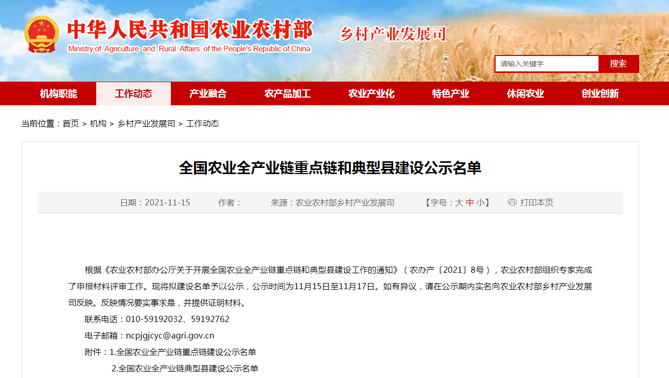根據《農業農村部辦公廳關于開展全國農業全產業鏈重點鏈和典型縣建設工作的通知》(農辦產〔2021〕8號),農業農村部組織專家完成了申報材料評審工作。現將擬建設名單......