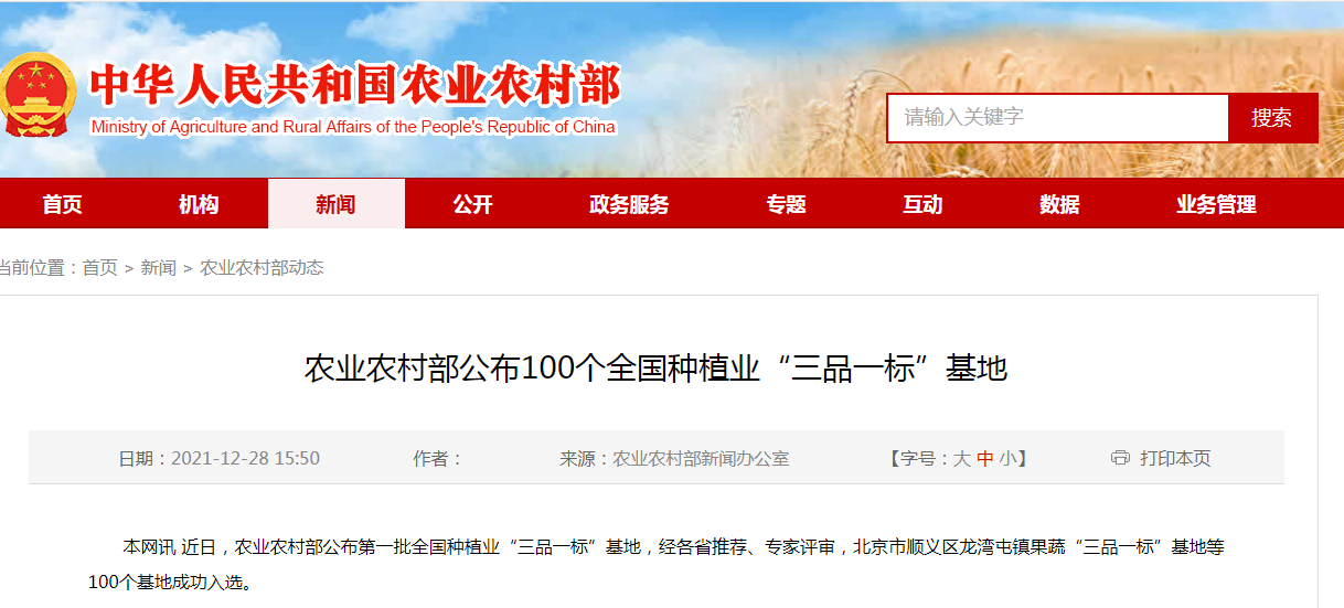 本網訊 近日,農業農村部公布第一批全國種植業“三品一標”基地,經各省推薦、專家評審,北京市順義區龍灣屯鎮果蔬“三品一標”基地等100個基地成功入選。 今......