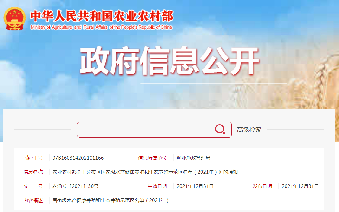 為貫徹落實2021年中央1號文件關于推進水產綠色健康養殖有關精神,根據《農業農村部關于印發〈國家級水產健康養殖和生態養殖示范區管理辦法(試行)〉的通知》(農漁發......