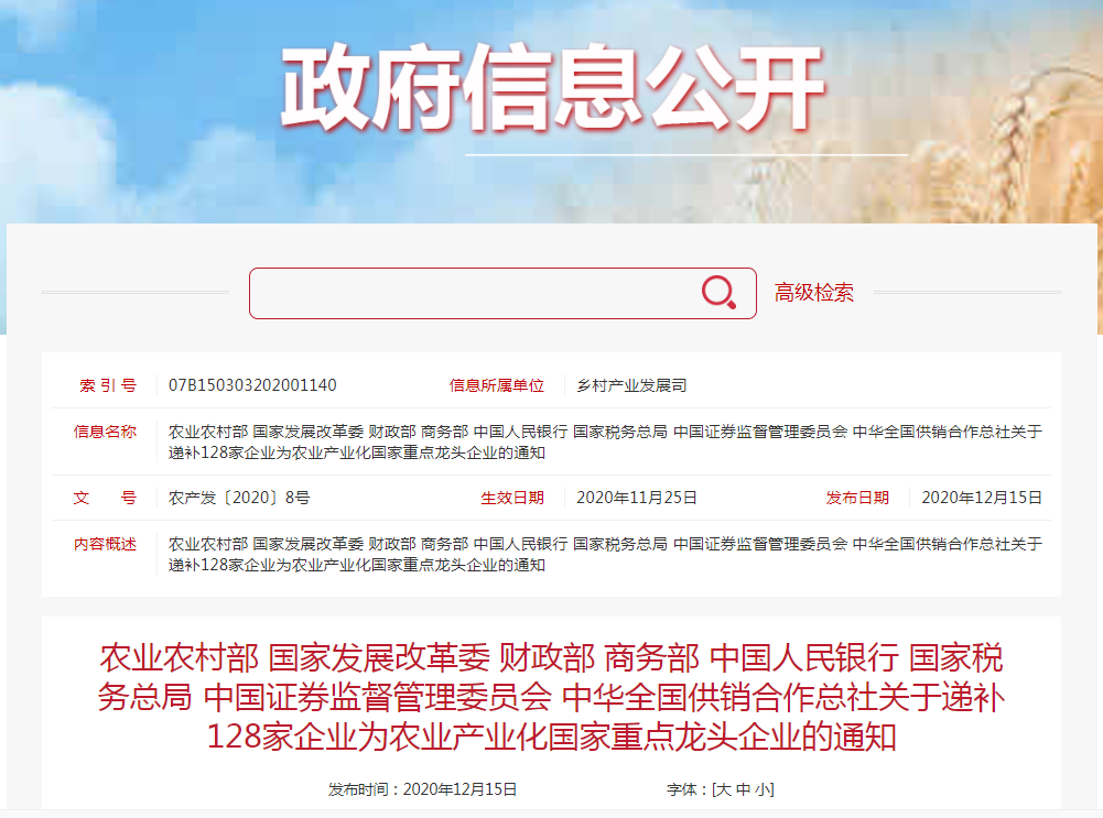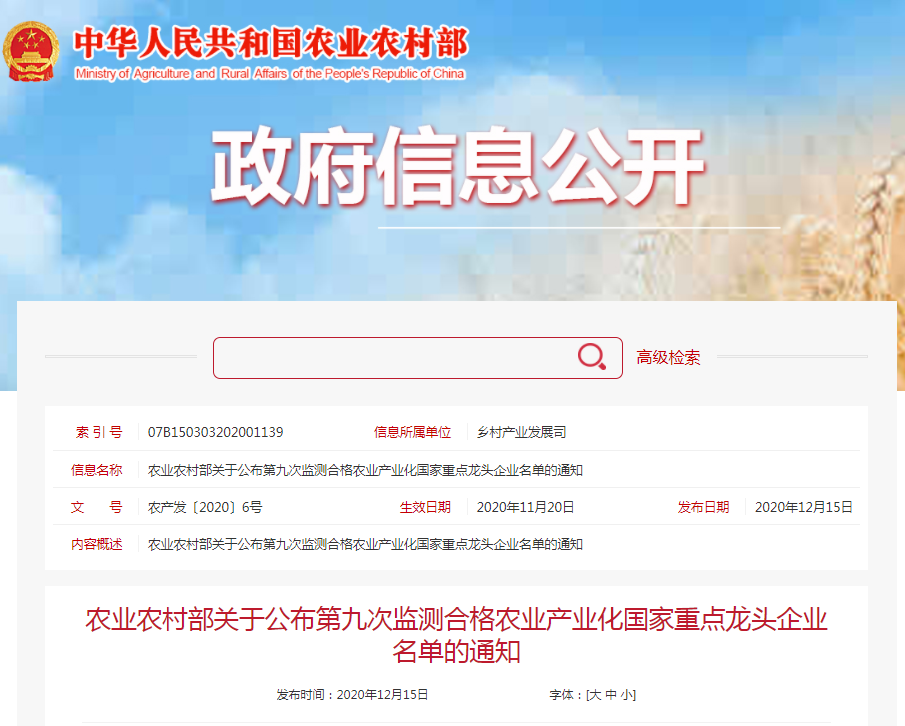 按照《農業產業化國家重點龍頭企業認定和運行監測管理辦法》規定和《農業農村部辦公廳關于開展農業產業化國家重點龍頭企業監測工作的通知》(農辦產〔2020〕3號)要求......