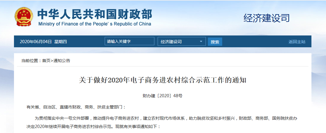 6月1日,財政部發布關于做好2020年電子商務進農村綜合示范工作的通知。《通知》提出,大力發展農村電子商務,促進形成農產品進城和工業品下鄉暢通、線上線下融合、涉......