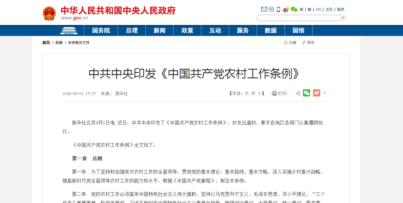 新華社北京9月1日電 近日,中共中央印發(fā)了《中國(guó)共產(chǎn)黨農(nóng)村工作條例》,并發(fā)出通知,要求各地區(qū)各部門(mén)認(rèn)真遵照?qǐng)?zhí)行。...