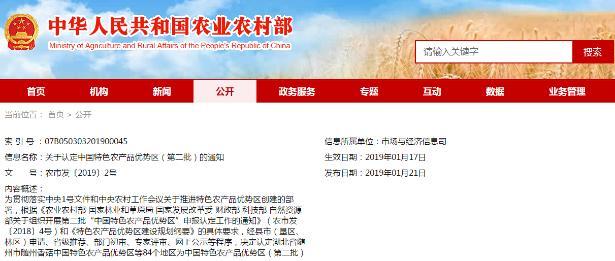 關于認定中國特色農產品優勢區(第二批)的通知各省、自治區、直轄市農業農村(農牧)、畜牧獸醫、農墾、漁業廳(局、委、辦),農辦,林業草原、發展改革、財政、科技、自......