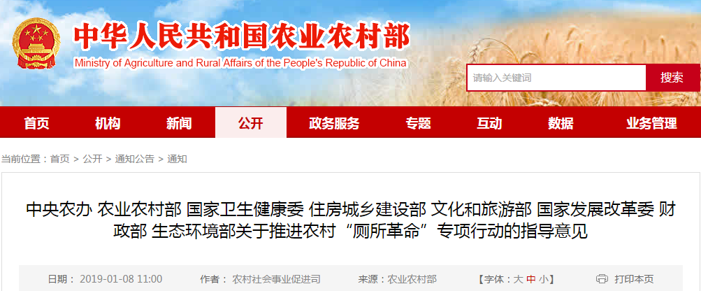 中央農辦 農業農村部 國家衛生健康委 住房城鄉建設部文化和旅游部 國家發展改革委 財政部 生態環境部關于推進農村“廁所革命”專項行......