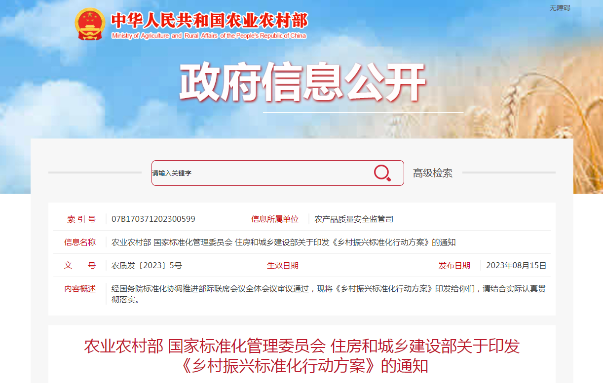 經國務院標準化協調推進部際聯席會議全體會議審議通過,現將《鄉村振興標準化行動方案》印發給你們,請結合實際認真貫徹落實。農業農村部 國家標準化管理委員會 住房......