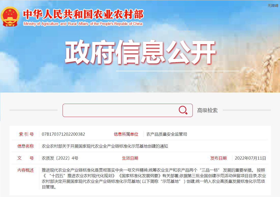 各省、自治區(qū)、直轄市農(nóng)業(yè)農(nóng)村(農(nóng)牧) 廳(局、委) ,新疆生產(chǎn)建設(shè)兵團(tuán)農(nóng)業(yè)農(nóng)村局: 推進(jìn)現(xiàn)代農(nóng)業(yè)全產(chǎn)業(yè)鏈標(biāo)準(zhǔn)化是貫徹落實(shí)中央一號文件精神,統(tǒng)籌農(nóng)業(yè)生產(chǎn)和......