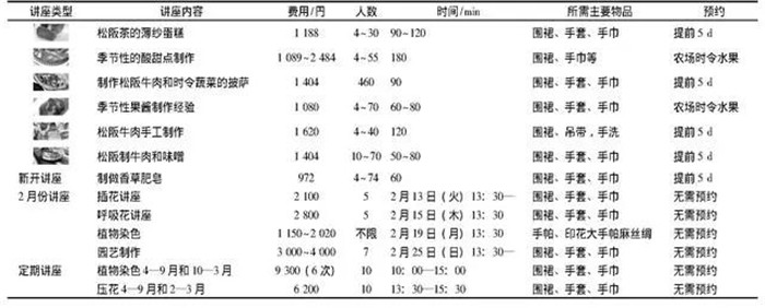課程講座內容富有特色且細致系統, 具有一定的理論深度。上課時間和頻率都較為固定, 有助于培養市民對現代農業公園的依賴感和歸屬感。公園官方網站上也會及時更新每月講座預告, 并詳細介紹講座內容、時間、地點、限定人數 (部分需要預約) 和費用 (分為會員費用和非會員費用, 表格中的費用為日元円) 以及補充說明需要準備的材料及適合聽講的人群年齡段等非常詳細的信息。